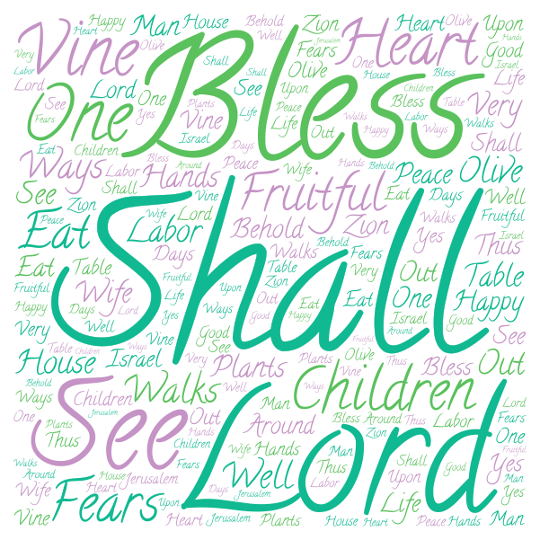 Psalm 128 January 6, 2015 · by lightexpectations · Bookmark the permalink. · Blessed is every one who fears the Lord, Who walks in His ways. When you eat the labor of your hands, You shall be happy, and it shall be well with you. Your wife shall be like a fruitful vine In the very heart of your house, Your children like olive plants All around your table. Behold, thus shall the man be blessed Who fears the Lord. The Lord bless you out of Zion, And may you see the good of Jerusalem All the days of your life. Yes, may you see your children’s children. Peace be upon Israel! ~ Share this: Click to email a link to a friend (Opens in new window) Email Click to share on X (Opens in new window) X Click to share on Facebook (Opens in new window) Facebook Click to share on Pinterest (Opens in new window) Pinterest Click to print (Opens in new window) Print Like Loading... Related