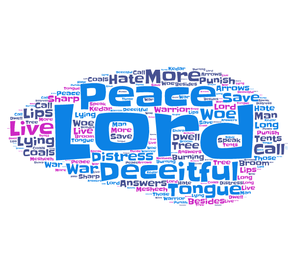 Psalm 120 November 16, 2015 · by lightexpectations · Bookmark the permalink. · I call on the Lord in my distress, and He answers me. Save me, O Lord, from lying lips and from deceitful tongues. What more will he do to you, and what more besides, O deceitful tongue? He will punish you with a warrior’s sharp arrows, with burning coals of the broom tree. Woe to me that I dwell in Meshech, that I live among the tents of the Kedar! Too long have I lived among those who hate peace. I am a man of peace; but when I speak, they are for war. ~ Share this: Click to email a link to a friend (Opens in new window) Email Click to share on X (Opens in new window) X Click to share on Facebook (Opens in new window) Facebook Click to share on Pinterest (Opens in new window) Pinterest Click to print (Opens in new window) Print Like Loading... Related